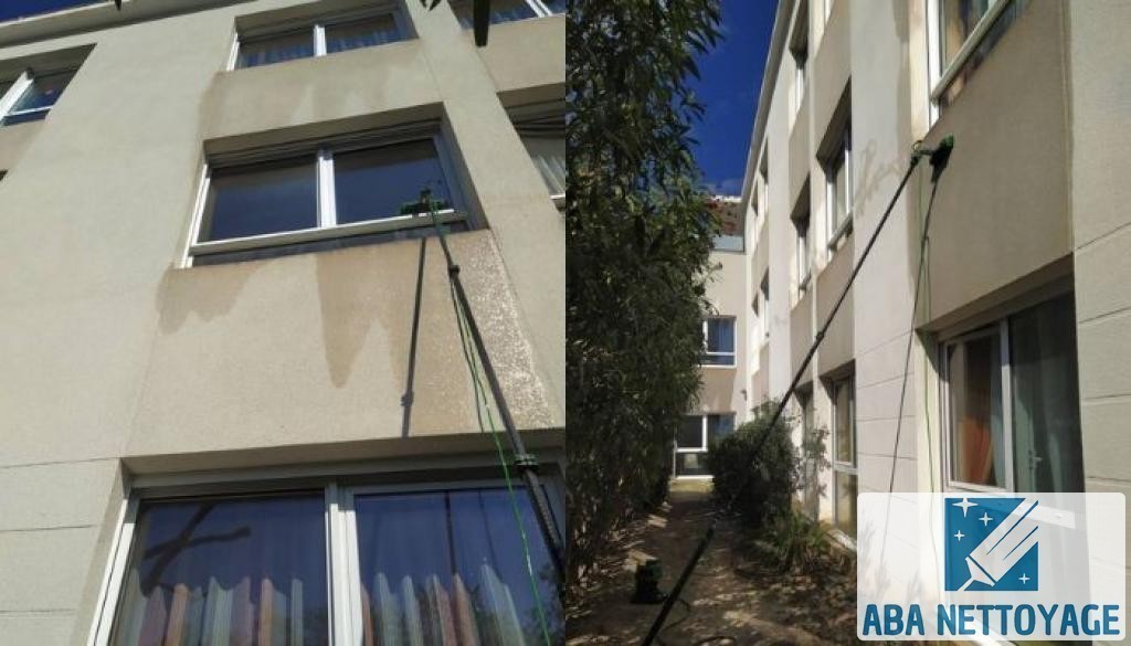 ~ Utilisation d'un système eau pure (osmoseur) et perches en carbone télescopique pour les accès difficiles et grandes hauteurs